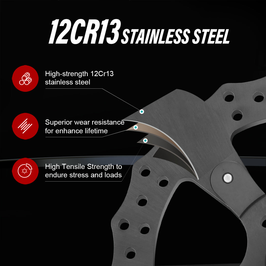 Robust Steel Construction - Our brake rotors are made from high-strength 12Cr13 stainless steel, offering superior wear resistance. This material significantly extends the lifespan of the brake discs, helping you save on replacement costs and maintenance frequency.