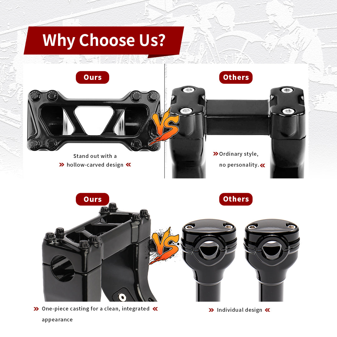Premium - Investment-cast and one piece structure provides safety over long term,Virtually eliminates handle bar slippage when using taller handlebars,Gloss black powder coated and hand-polish for rust resistance,made from hard steel.